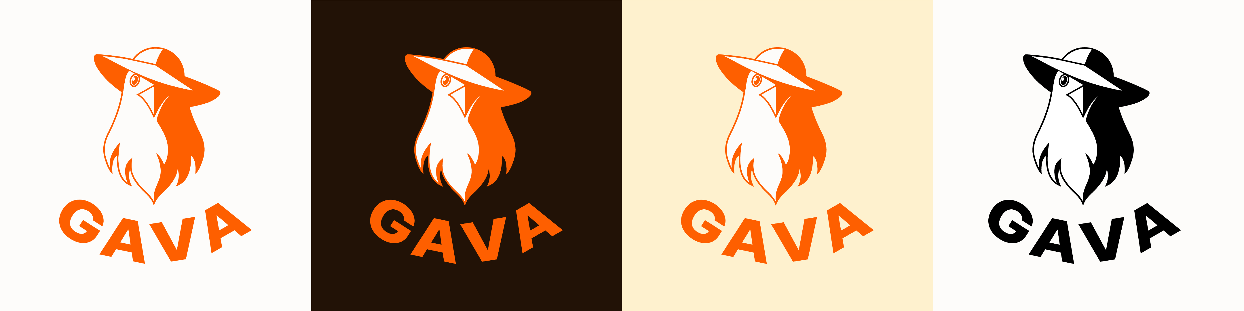 GAVA имеет классический комбинированный логотип, состоящий из знака и типографической надписи. Знаковость передает эмблема птицы в шляпе. Транслирует ценности, бунтарство и эмоции.