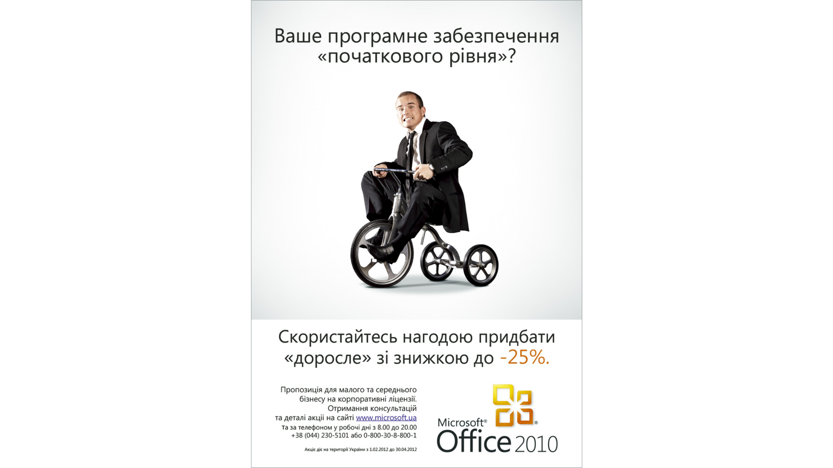 Реклама в финальном виде показала владельцам и руководителям малого и среднего бизнеса, как со стороны выглядит работа с устаревшими или нелицензионными версиями пакета программ. Для бизнесов логичнее ездить на более быстрых двухколесных велосипедах, а потому вижуал от нас предложил им повзрослеть. Благодаря кампании пользователи узнали о скидке в 25%, и пересели на корпоративную лицензию софта Microsoft 2010.